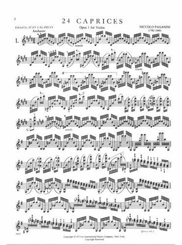 The International Music Company has two editions of Paganini's Caprices: One by Carl Flesch(1873-1944) and one, more recent, by Ivan Galamian (1903-1981). Leopold Auer, Carl Flesh, and Ivan Galamian, three exceedingly famous violin teachers, all assigned "The Caprices" to their advanced students and to this day, Niccolo Paganini and his 24 etudes stand to represent the apex of violin technique. There have been innovative uses of the violinistic devices and special effects employed by the virtuoso since, but his improvisational performances, often transcribed and compiled by admirers, definitively established the canon of modern violin technique. "24 Caprices" is the only representation of his work that Paganini allowed for publication in his lifetime. While Paganini revealed that patience was the key to conquering violin playing, he had none for teaching or otherwise divulging his performance secrets. As for this edition of the work, like Paganini, Mr. Galamian had huge hands and fingerings to match. This should not deter the serious student from choosing Galamian's edition in this case, for it is both highly musical and playable: My favorite mix.